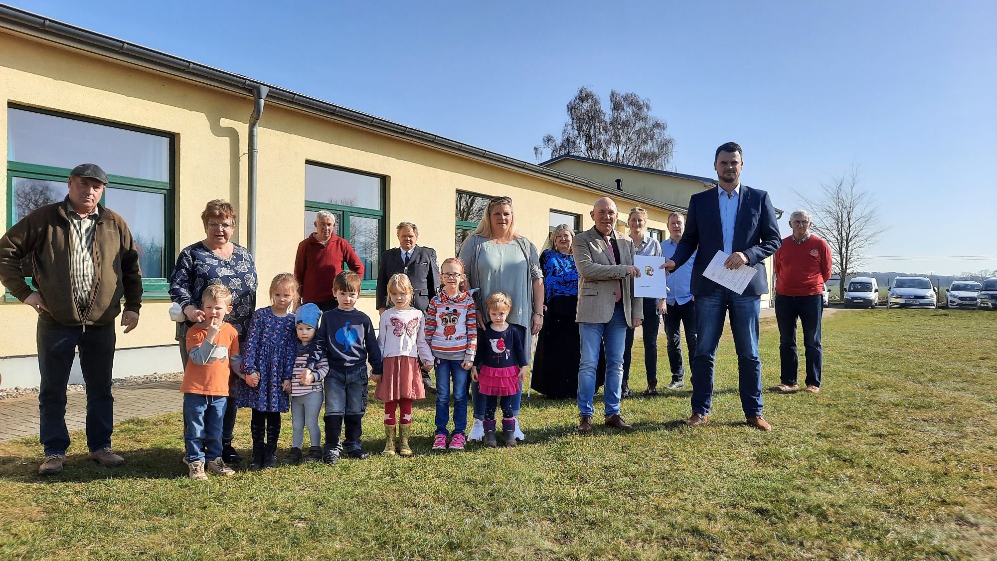 Entstehen soll ein kompletter Kita-Neubau auf einer bestehenden Freifläche am Dorfgemeinschaftshaus. „Anstatt weiter Geld in die Sanierung des alten Kindergartens aus DDR-Zeiten zu stecken, haben wir uns für einen Neubau hier entschieden. Der neue Standort kann auch für das Gemeinschaftshaus zu einer besseren Nutzung und zu Synergien führen. So können zum Beispiel die Veranstaltungsräume hier mit genutzt werden.“, so Bürgermeister Erich Weidemann bei der Übergabe. Knapp zwei Jahre seit seinem Amtsantritt hat er sich für die Großinvestition in der 780-Einwohner Gemeinde eingesetzt.