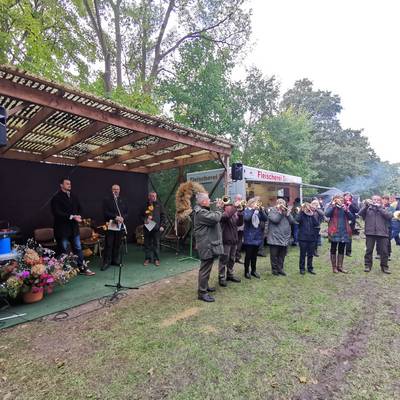 Gemeinsam mit dem Vorsitzenden des Kreisjagdverbandes Renee Pollak und dem Vorsitzenden des Kreisbauernverbandes Daniel Bohl läutete Landrat Tino Schomann gegen 10 Uhr die Wildsaison ein. Dabei wurden sie stilecht von einer Jagdhorngruppe mit einem Ständchen begrüßt.