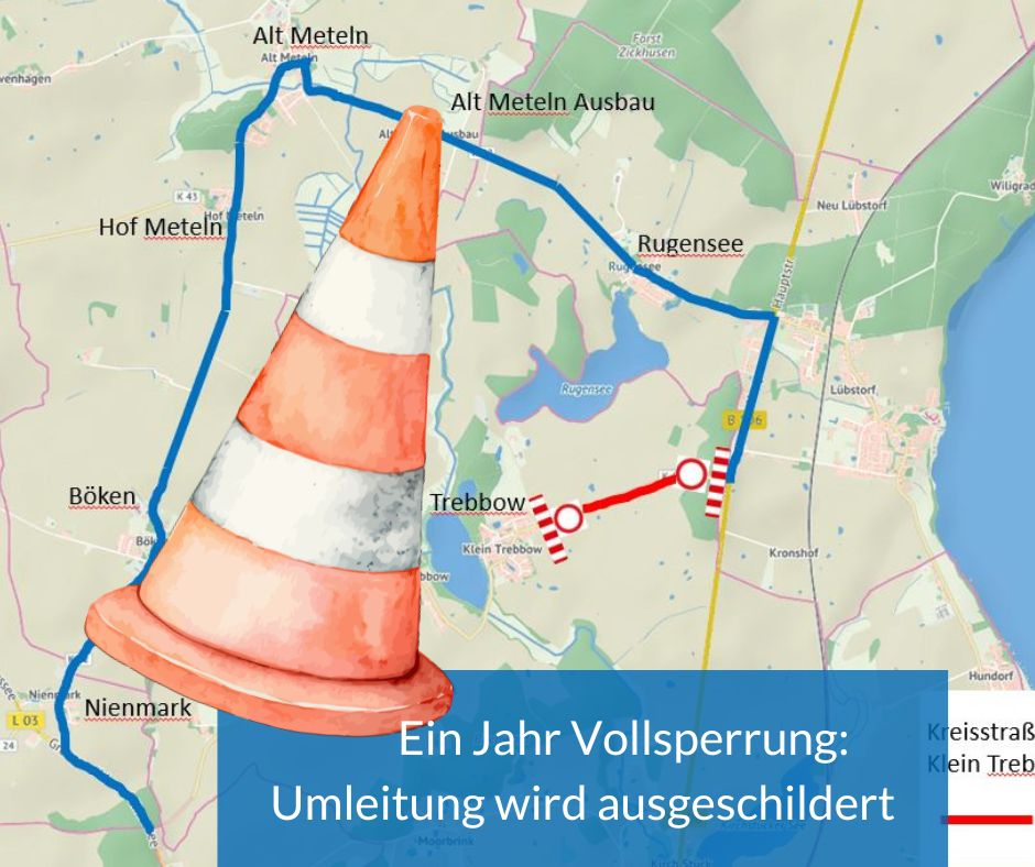 Unter Vollsperrung baut der Landkreis Nordwestmecklenburg die Kreisstraße K 46 zwischen Klein Trebbow und der Bundesstraße B 106 auf einer Länge von circa 1,6 Kilometern und einer Breite von 5,5 Metern grundhaft neu aus. Die Bauarbeiten sollen vom 2. März 2026 bis voraussichtlich 28. Februar 2027 andauern. Eine Umleitung wird ausgeschildert.