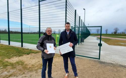 Zwar wird der Kunstrasenplatz schon für den Vereinssport benutzt, aber die Zuwegung fehlt noch. Für die 6,50 breite und 220 Meter Zufahrt, sowie Leuchten am Weg und Parkmöglichkeiten an der Anlage überbrachte Landrat Tino Schomann einen Förderbescheid in Höhe von 436.919,67 Euro gemäß der Richtlinie für die Förderung der integrierten ländlichen Entwicklung (ILERL M-V). Das sind 90 Prozent der förderfähigen Summe, die Gemeinde selbst steuert rund 105.000 Euro Eigenmittel bei.