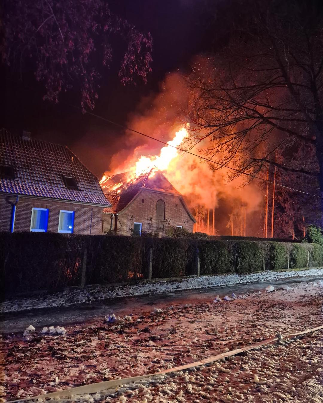 „Ich bin über die Leitstelle laufend informiert worden. Besonders die Evakuierung der umliegenden Bewohnerinnen und Bewohner wegen Munition im Haus hat ein mulmiges Gefühl bei mir als Feuerwehrmann hinterlassen“, sagt Landrat Tino Schomann. Auch Gasflaschen in der brennenden Scheune und die Minusgrade erschwerten die Löscharbeiten. Wenn das Wasser nicht lief, vereisten die Strahlrohre in kürzester Zeit. Das gefrorene Wasser auf den Wegen wurde zusätzlich zur Rutschgefahr.