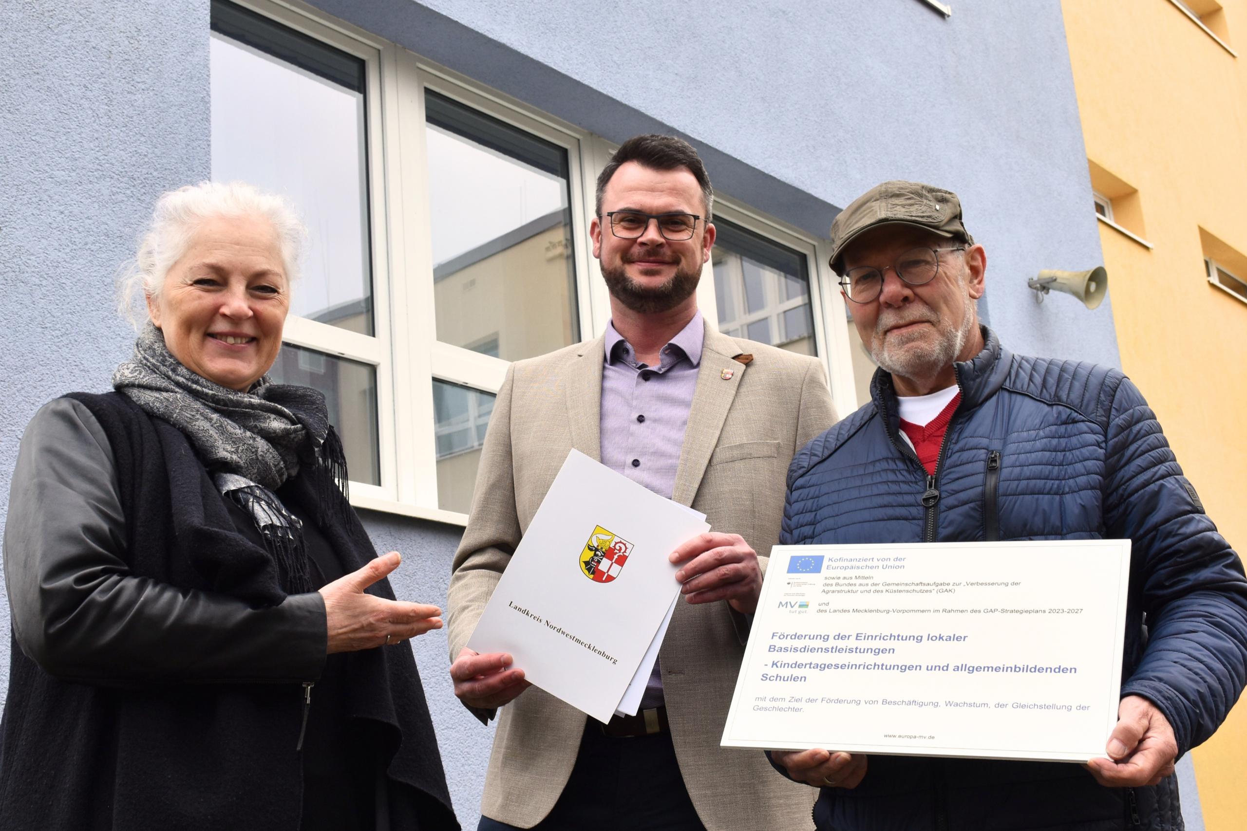 Der nächste Sommer kommt bestimmt: Und weil das so ist, benötigt die Regionale Schule mit Grundschule „Am Schweriner See“ in Bad Kleinen dringend Außenmarkisen zur Beschattung der Schule. Grund: Bei steigenden Außentemperaturen in den Sommermonaten waren die Lernbedingungen für die Schülerinnen und Schüler in der Vergangenheit nicht optimal. Zur Finanzierung der knapp 92 Tausend Euro teuren Neuanschaffung hat Landrat Tino Schomann einen Zuwendungsbescheid in Höhe von mehr als 55,1 Tausend Euro an Bad Kleinens Bürgermeister Joachim Wölm und Schulleiterin Ute Vandreier überreicht.