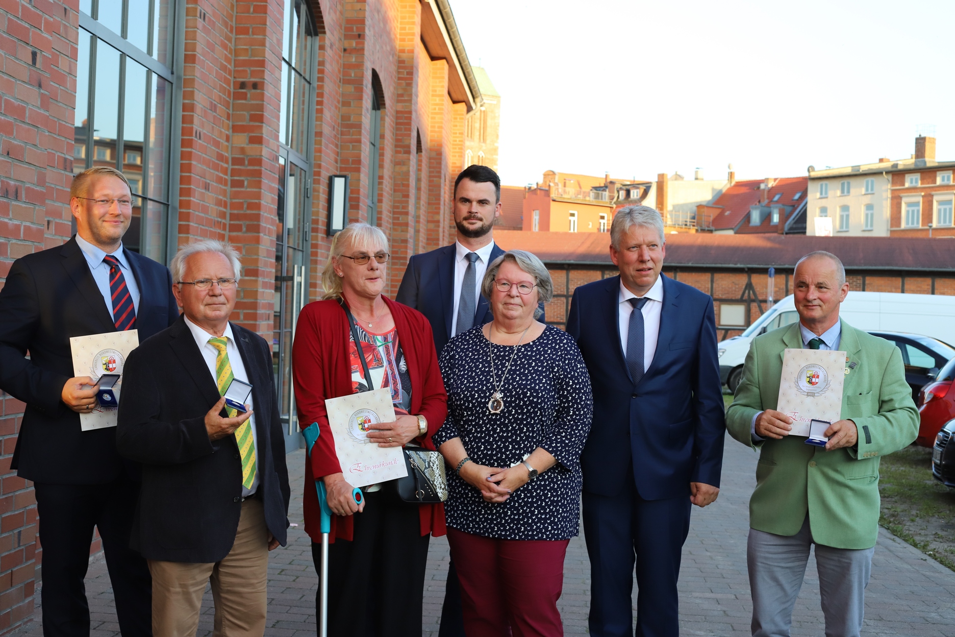 Im Wechsel verliehen Landrat Tino Schomann und Kreistagspräsident Thomas Grote fünf Ehrennadeln des Landkreises. Die Ausgezeichneten bildeten ein weites Spektrum des Ehrenamtes in Nordwestmecklenburg ab: