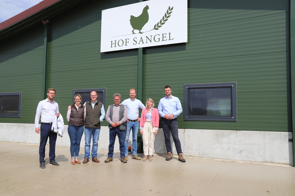 Als dritte Station wurde der Hof Sangel besichtigt, den Sven Sangel mit seiner Frau in den letzten Jahren zu einem der größten Legehennen-Betriebe der Region ausgebaut hat. Neben einem großen Freiluftgelände unter Pappeln kam im letzten Jahr auch ein Stall dazu. 6 Millionen Eier werden hier jährlich umgesetzt – ein Großteil mit dem Label des deutschen Tierschutzbundes als Freilandeier.