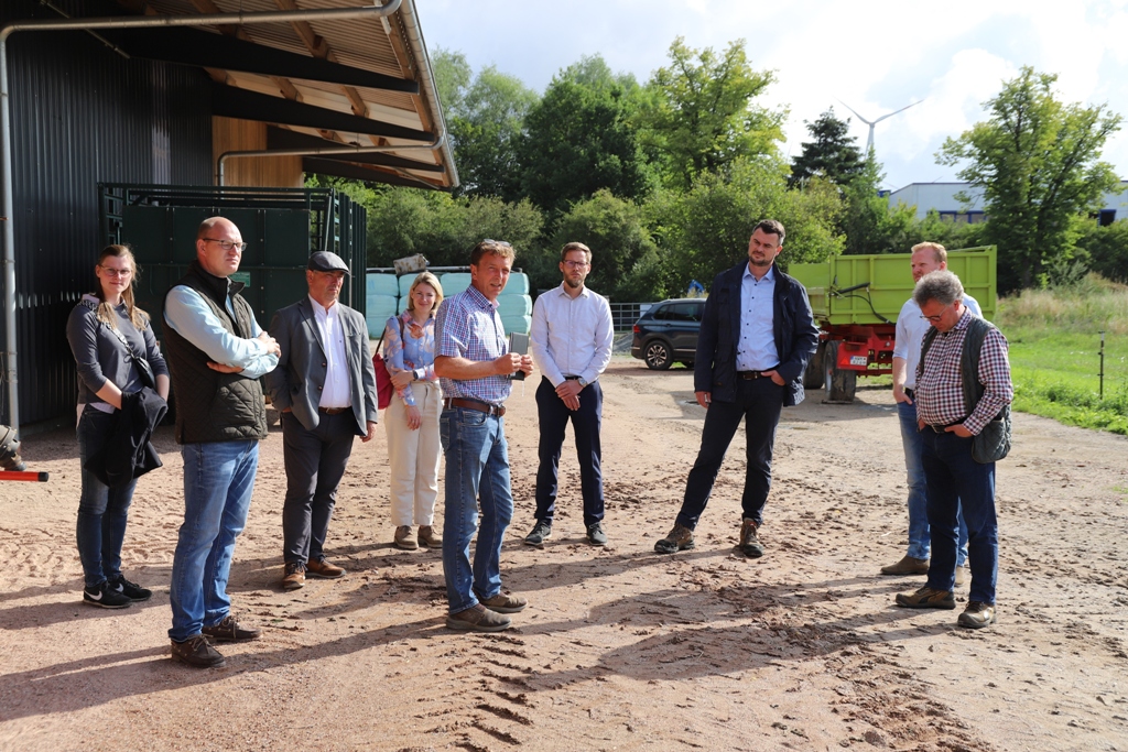 Die Gruppe traf sich zuerst auf dem Hof von Rainer Jörke, der am Schönberger Ortsrand nicht nur Acker- und Grünland bewirtschaftet, sondern auch Zuchtrinder hält.