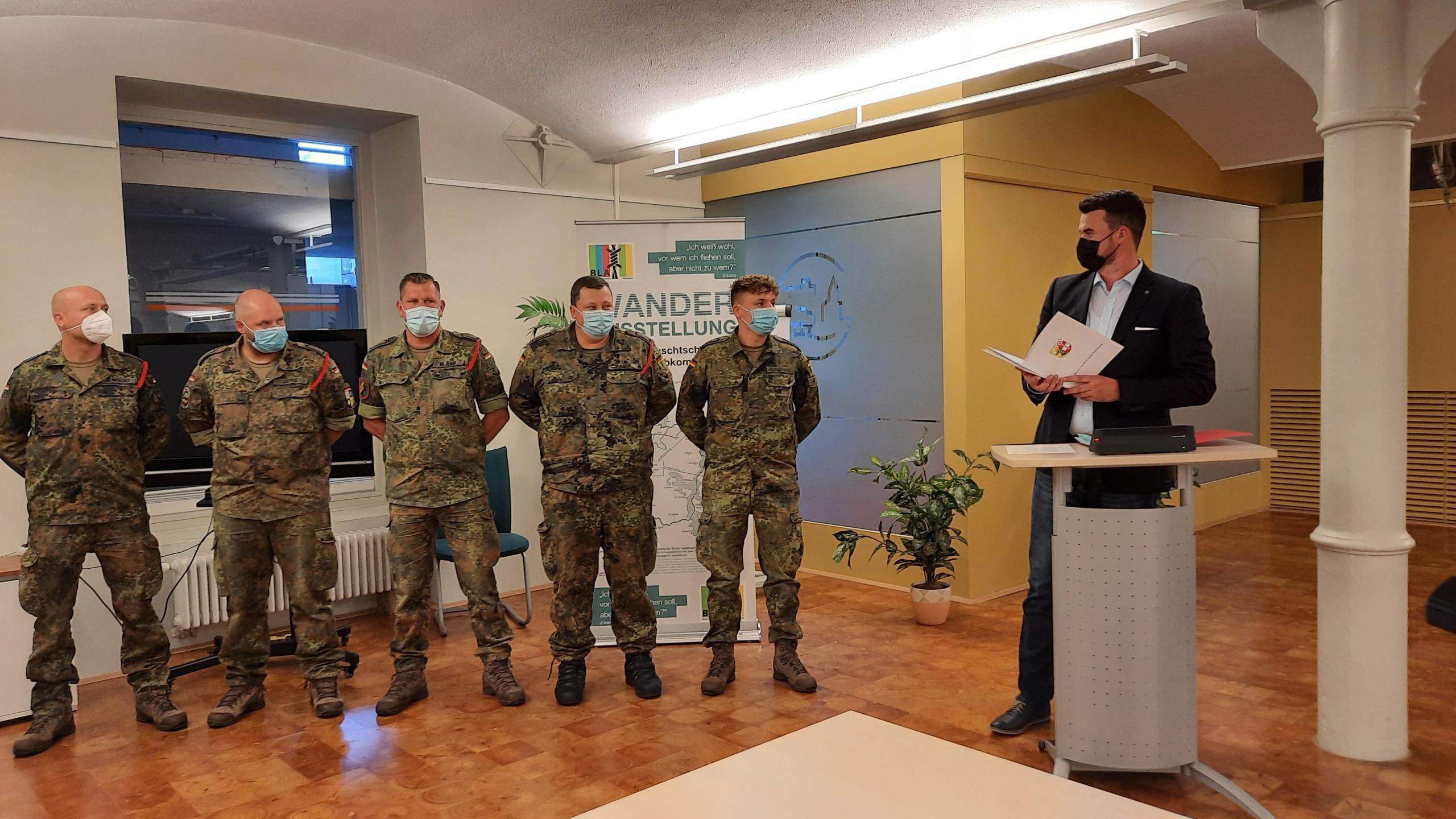 Dabei ging es darum „Danke“ zu sagen, wie der Landrat in seiner Begrüßung eröffnete: Seit Mitte 2020 unterstütze die Bundeswehr mit zeitweise bis zu 50 Soldaten gleichzeitig den Landkreis bei der Pandemiebekämpfung, insgesamt waren es über 200, die in den Impfzentren, aber schon davor in der Kontaktnachverfolgung und der Kontaktbetreuung, sowie in den Testzentren ausgeholfen hatten.