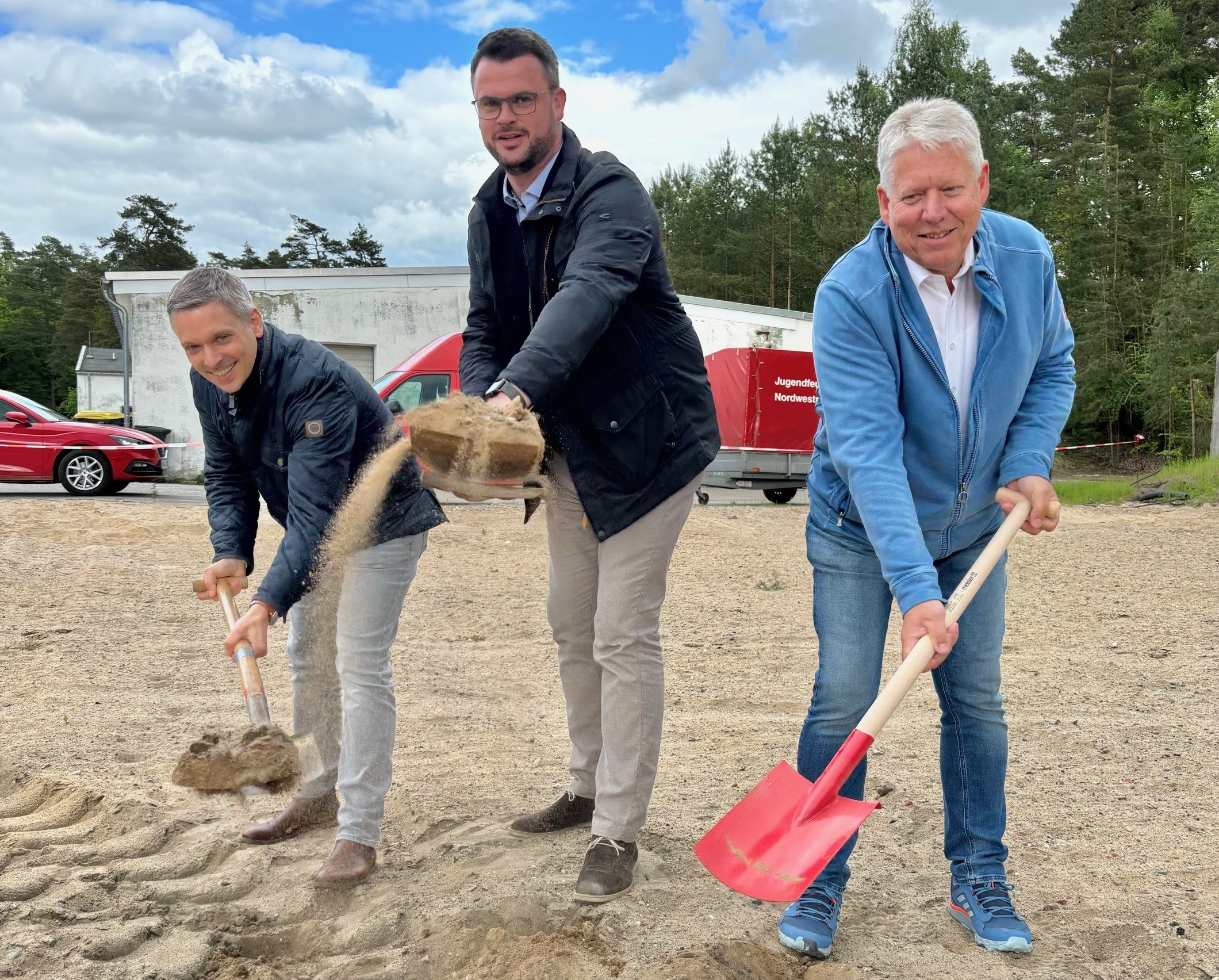 Den ersten Spatenstich für den Ersatzneubau der Fahrzeughalle nahmen Martin Kopp (Geschäftsführer Gewerbe- und Technik-Zentrum Nordwestmecklenburg), Nordwestmecklenburgs Landrat Tino Schomann sowie Kreistagspräsident Thomas Grote (von links) gemeinsam vor.