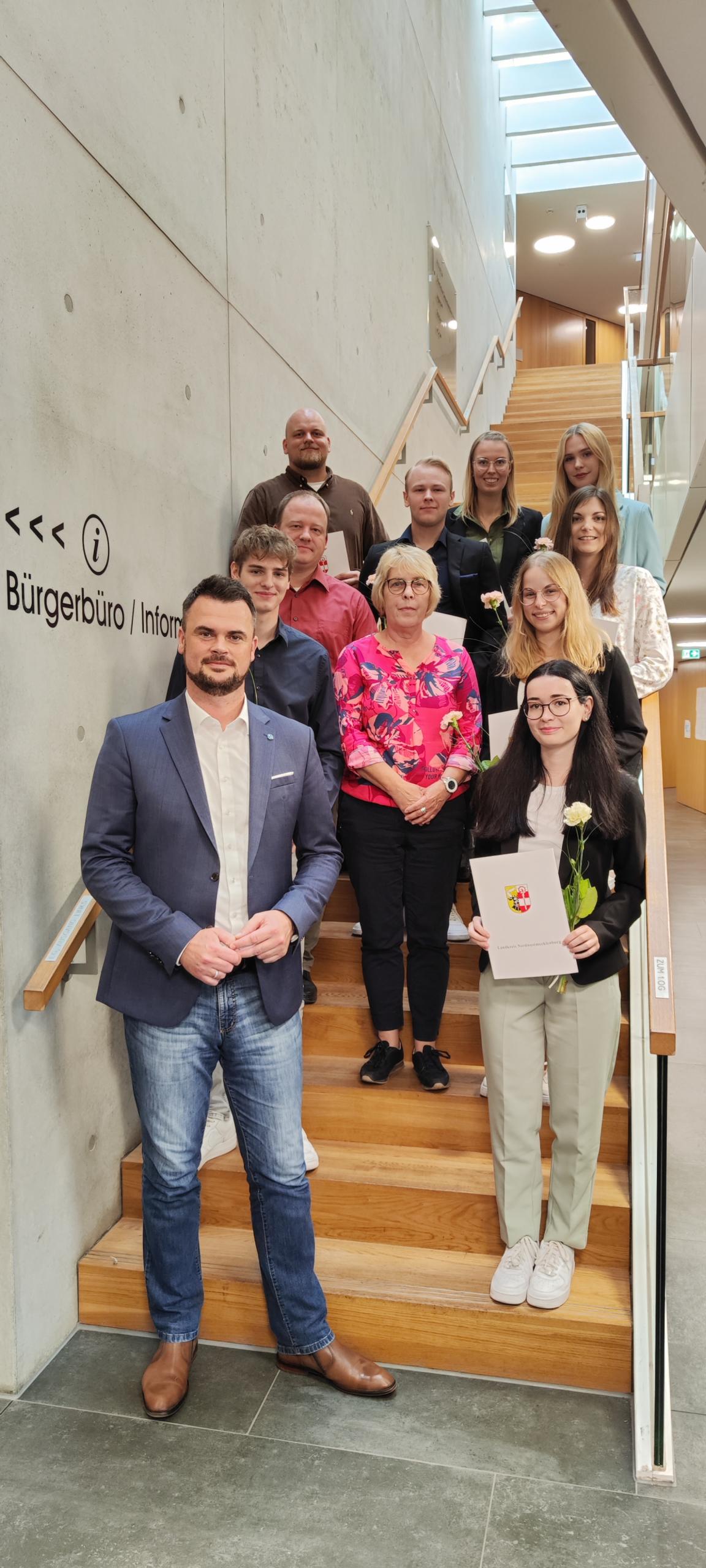 Am Vormittag des 29. September gab es mehrfachen Grund zur Freude am Verwaltungsstandort in Wismar: Landrat Tino Schomann und Ausbildungsleiterin Susanne Splitter konnten in Wismar gleich mehrere engagierte Beamtinnen und Beamte ehren.